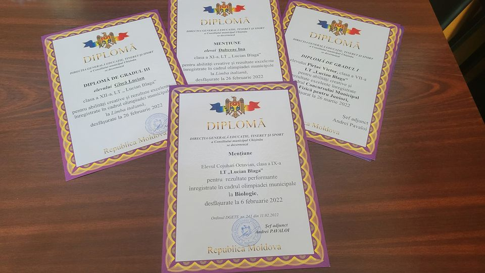 Este timpul să culegem roadele. Călduroase felicitări elevilor Gîscă Lucian, cl.12-a, Dubceac Ina, cl.11, Cojuhari Octavian, cl.9-a A și Pîrțac Victor pentru meritele deosebite obținute în concursurile municipale la Limba italiană, Biologie, Fizică, Matematică. Sincere mulțumiri cadrelor didactice care i-au îndrumat Croitor Iulia, Crîngaci Olesea, Curlicovschii Alisa, Buga Eugenia.